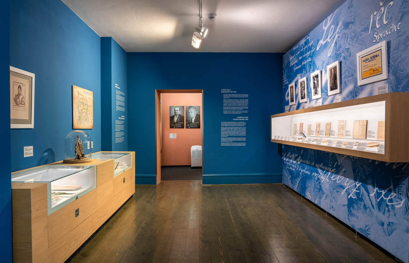 W tematiski ako rěcny rum pómjenjonej wustajeńskej rumnosći prezentěruju se wubrane dolnoserbske rěcne pomniki – mjazy drugim faksimile nakšomneje glose w dolnoserbskej rěcy z lěta 1510, kótaraž jo nejstarše źinsa znate pisne znankstwo serbskeje rěcy.