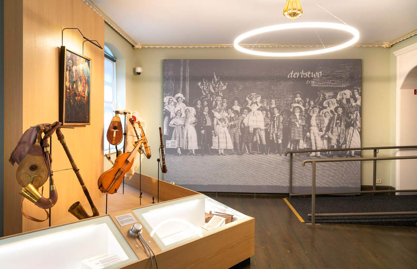 How tematizěruju se tradicionelna serbska ludowa muzika, muzikowe instrumenty, serbska wuměłska a chorowa muzika ako tež rozwjaseleńska a rejowańska muzika. Wušej togo se pśedstajiju wuznamne dolnoserbske twóriśele muziki a woplěwanje derbstwa pśez lajskich a powołańskich jawišćowych wuměłcow.